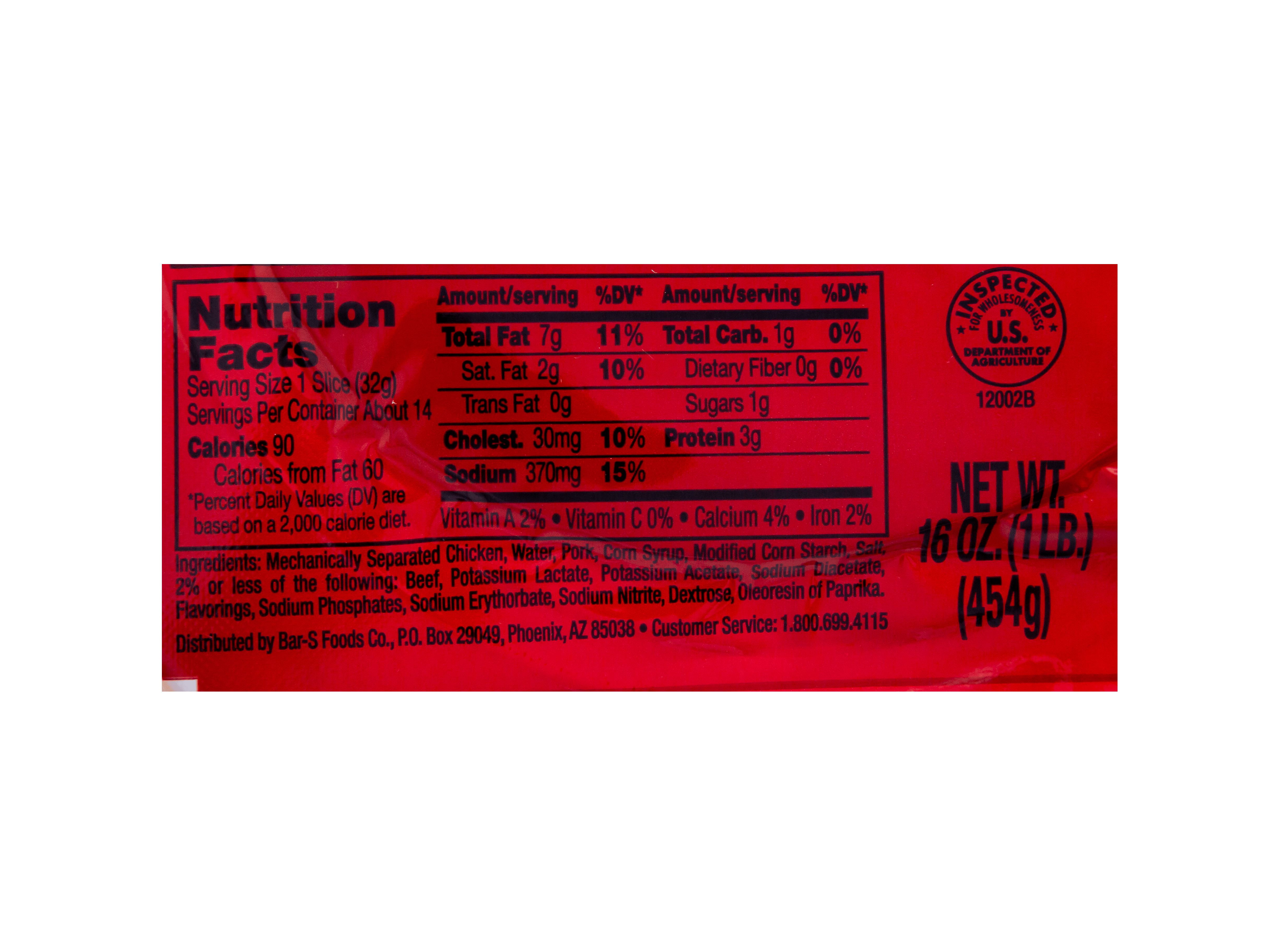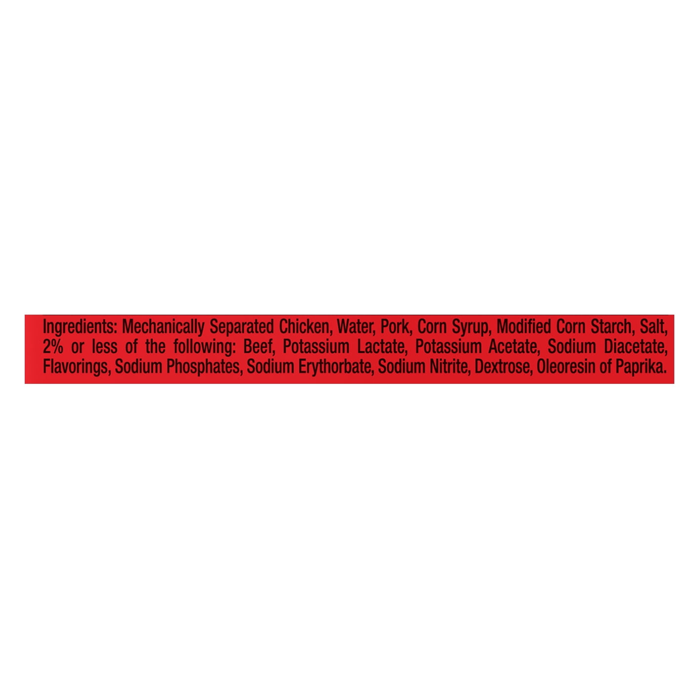Mechanically Separated Chicken, Water, Pork, Corn Syrup, Modified Corn Starch, Salt, 2% or Less of the Following: Beef, Potassium Lactate, Potassium Acetate, Sodium Diacetate, Flavorings, Sodium Phosphates, Sodium Erythorbate, Sodium Nitrite, Dextrose, Oleoresin of Paprika.