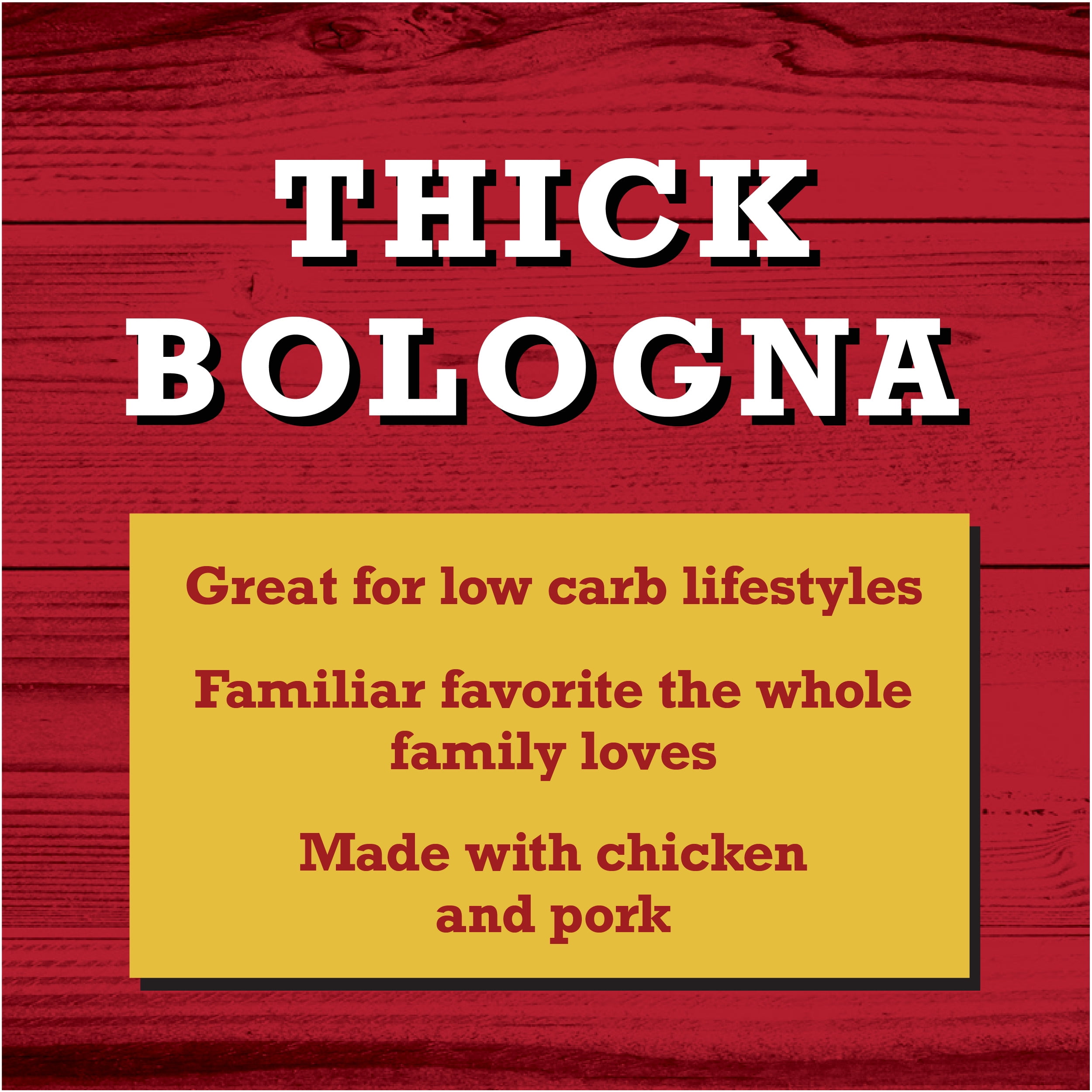 Bar-S Thick Bologna is made from top-quality, USDA-inspected meats. The thick flavor is ideal for any bologna lover, offering a smooth texture and traditional taste that is familiar to many. The thicker slices are great for frying. You probably remember the bologna sandwich of your youth, enjoyed cold with mayo and mild cheese on white bread, packed up in a brown paper bag. The classic American lunch meat conjures a certain nostalgia, but adults continue to enjoy this sliced deli staple for lunch, dinner, or even as a late-night snack.