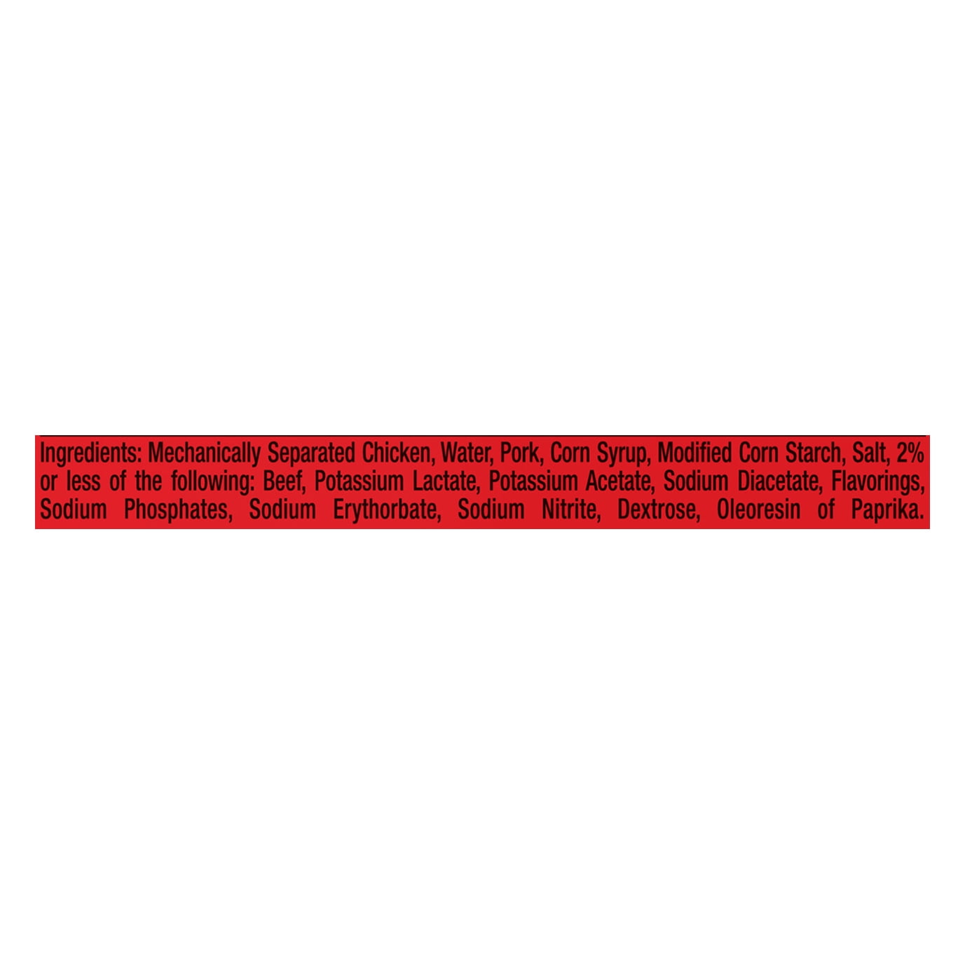 Mechanically Separated Chicken, Pork, Water, Corn Syrup, Salt, 2% or less of the following: Beef, Modified Corn Starch, Potassium Lactate, Potassium Acetate, Sodium Diacetate, Flavorings, Sodium Phosphates, Sodium Erythorbate, Sodium Nitrite, Dextrose, Oleoresin of Paprika.
