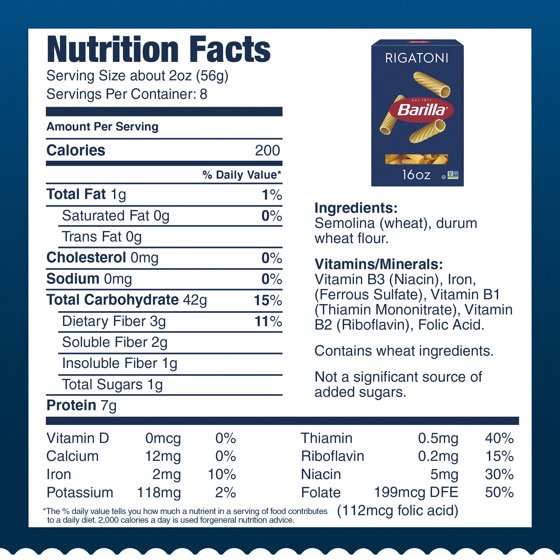 Semolina (Wheat), Durum Wheat Flour, Vitamins/Minerals: Vitamin B3 (Niacin), Iron (Ferrous Sulfate), Vitamin B1 (Thiamine Mononitrate), Vitamin B2 (Riboflavin), Folic Acid