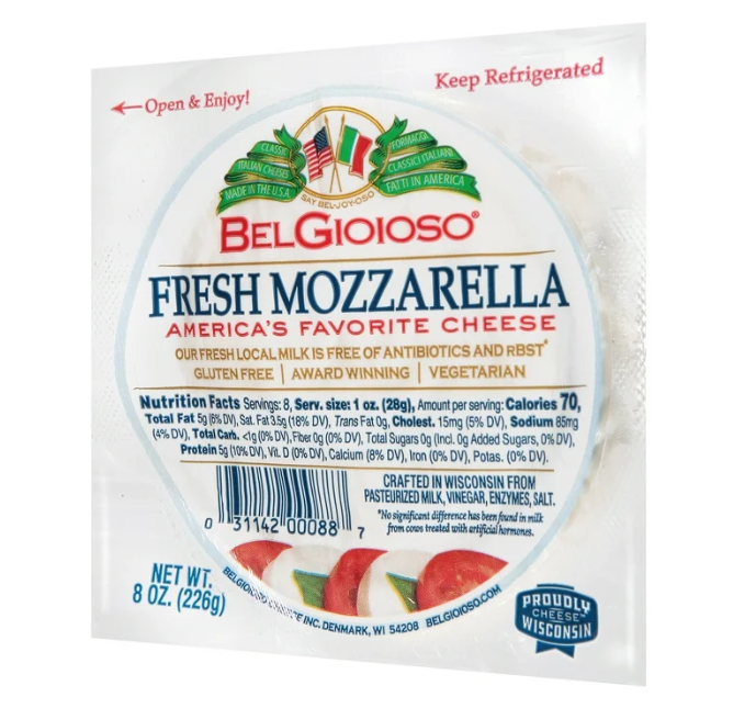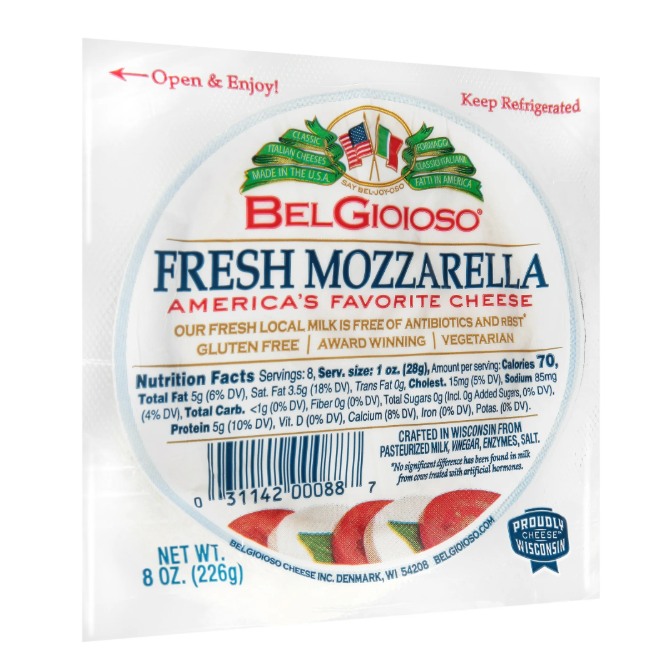 BelGioioso Fresh Mozzarella begins with fresh, local milk, and quality ingredients. The result is a creamy porcelain white cheese with a delicate and light flavor profile. Sealed in an 8-ounce plastic vacuum pack package for freshness, BelGioioso Fresh Mozzarella is not pre-portioned, allowing you the freedom to chop, slice or cube. Pair this award winning Fresh Mozzarella with an assortment of hard cheeses, almonds and wine for a gourmet cheese board that's sure to impress your guests. Serve a Caprese salad by slicing mozzarella with marinated Roma tomatoes and fresh basil, and drizzling with extra virgin olive oil and/or balsamic reduction. However you indulge in this carefully cultivated cheese, you'll be sure to enjoy the distinctive taste and texture of BelGioioso Fresh Mozzarella.