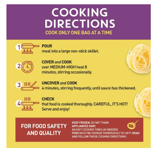 Cook thoroughly **Shallow Fry - From Frozen **Pour meal into a large nonstick skillet. **Cover and cook over medium-high heat 8 minutes, stirring occasionally. **Uncover and continue cooking 2 to 3 minutes, stirring frequently, until sauce is thickened. **Check that food is cooked thoroughly. Careful, it's hot! Serve and enjoy! **For Food Safety & Quality **Keep frozen. Do not thaw. **Appliances vary. Adjust cooking times as needed. **Food must be cooked thoroughly to 165°F. **Read and follow these cooking directions.