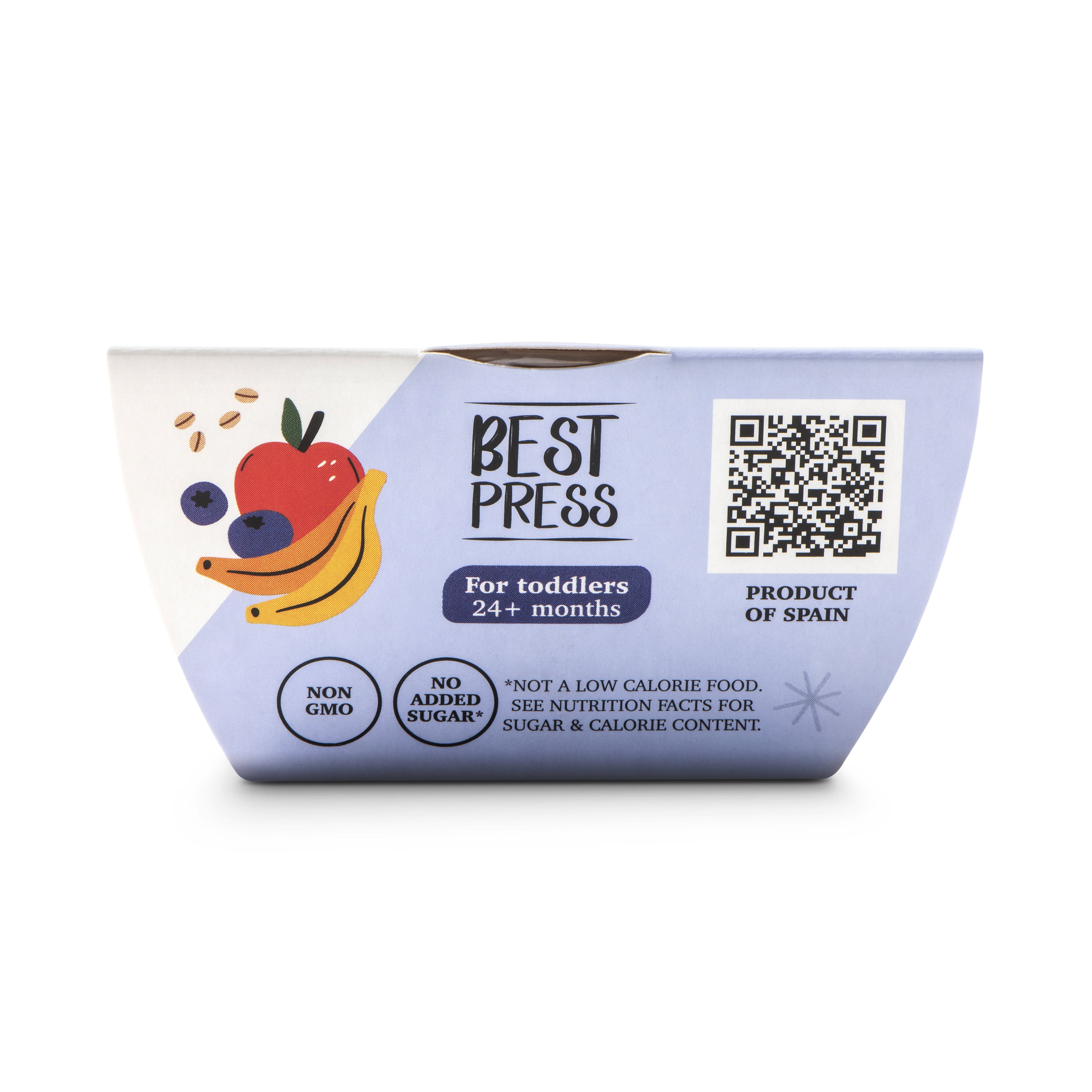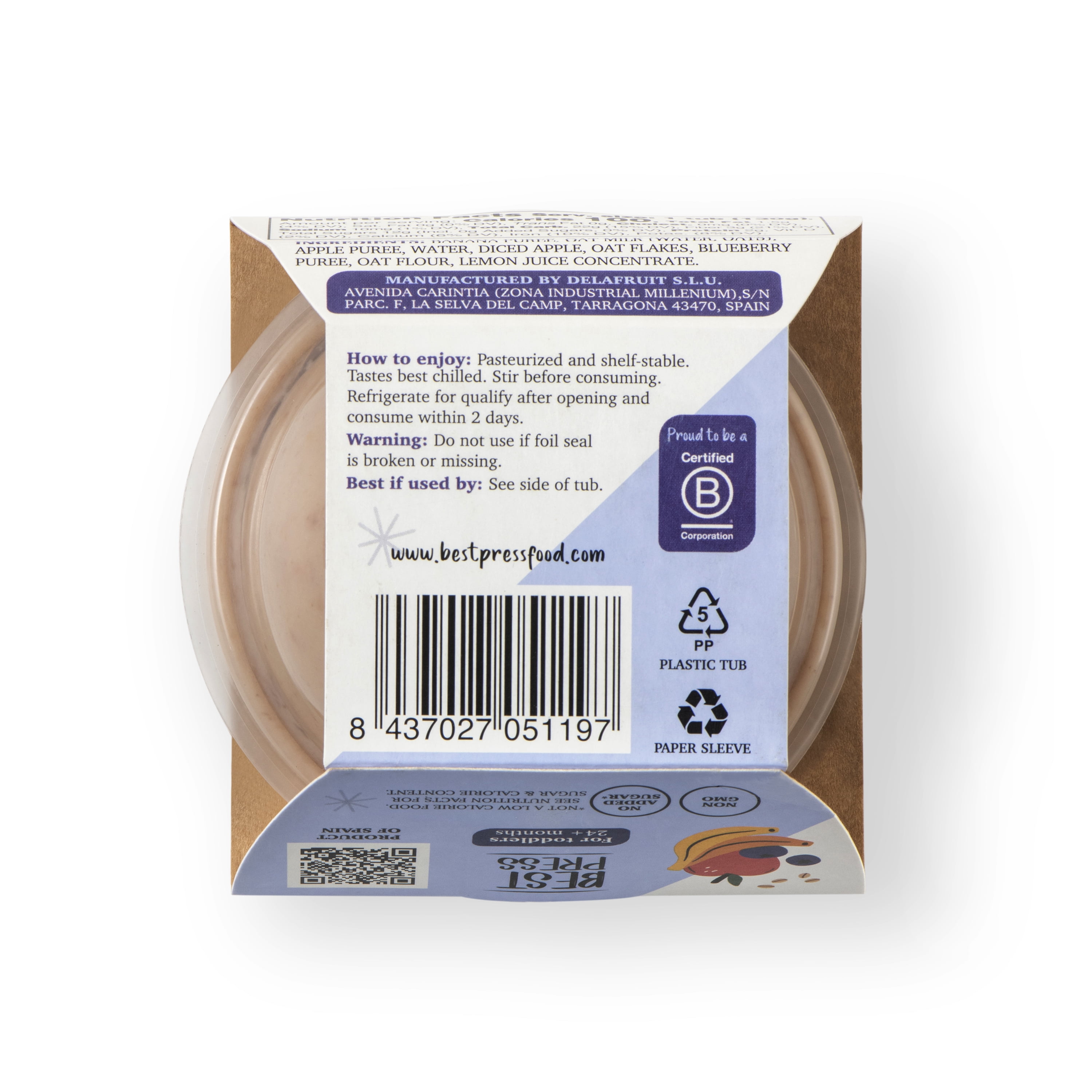 Best Press Banana Oat Drink Apple Blueberry and Oats for Toddlers (24 Months Plus) comes in a single-serve 4.6oz (130g) tub. This deliciously smooth blend of blueberries, apples, and bananas mixed with overnight oats creates a naturally sweet, wholesome meal made with real fruit. It contains no artificial ingredients and offers a texture suitable for toddlers to help them advance their palate.