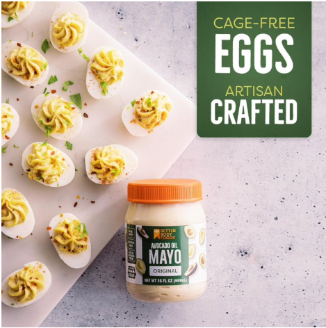 AVOCADO MAYO: Our BetterBody Foods avocado mayonnaise is made with avocado oil and cage-free eggs, and it is soy- and canola-free! Try this delicious alternative to traditional, canola-based mayonnaise with the benefits of avocado oil.