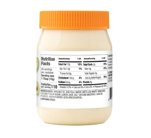 SIMPLE INGREDIENTS: Contains only avocado oil, egg yolk, water, distilled white vinegar, coconut palm sugar, lemon juice, salt, ground mustard, garlic powder and onion powder, EDTA.