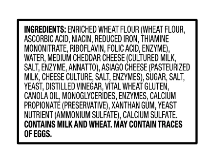 ENRICHED WHEAT FLOUR (WHEAT FLOUR, ASCORBIC ACID, NIACIN, REDUCED IRON, THIAMINE MONONITRATE, RIBOFLAVIN, FOLIC ACID, ENZYME), WATER, MEDIUM CHEDDAR CHEESE (CULTURED MILK, SALT, ENZYME, ANNATTO), ASIAGO CHEESE (PASTEURIZED MILK, CHEESE CULTURE, SALT, ENZYMES), SUGAR, SALT, YEAST, DISTILLED VINEGAR, VITAL WHEAT GLUTEN, CANOLA OIL, MONOGLYCERIDES, ENZYMES, CALCIUM PROPIONATE (PRESERVATIVE). XANTHAN GUM, YEAST NUTRIENT (AMMONIUM SULFATE), CALCIUM SULFATE. CONTAINS MILK AND WHEAT. MAY CONTAIN TRACES OF EGGS.