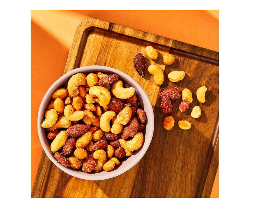 A blend of hot honey seasoned cashews, almonds, and peanuts