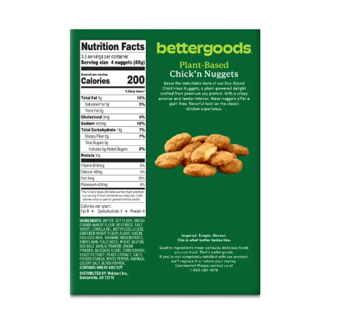 Savor the delectable taste of the bettergoods Plant Based Chick'n Nuggets, a plant powered delight crafted from premium soy protein. With a light crispy exterior and tender succulent interior, these nuggets offer a guilt free, flavorful twist on the classic chicken experience. Packed with eleven grams of protein per serving, these nuggets are the perfect any time of the day as an indulgence for vegetarians and anyone seeking a delicious meatless option. Simply pop them in the oven, air fryer or microwave according to the package instructions and you'll have tender, succulent, and crispy nuggets ready in a jiffy. Whether you're serving some up to your family for a quick snack or enjoying yourself as part of a delicious dinner, these nuggets bring the fun and flavor. So, don't hesitate, take a bite, and immerse yourself in the plant based goodness of the bettergoods Plant Based Chick'n Nuggets.