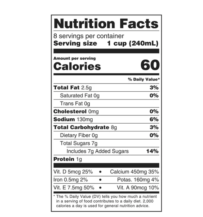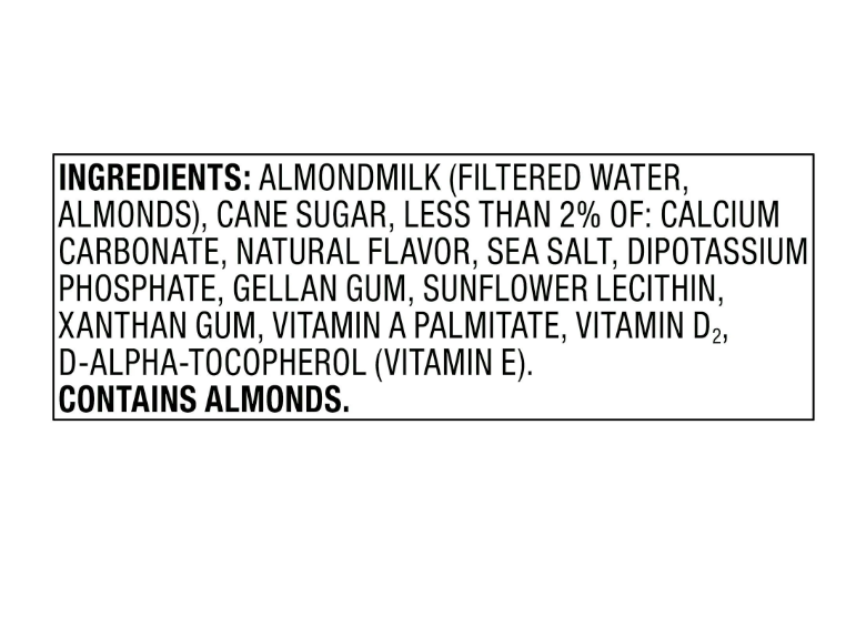 ALMONDMILK (FILTERED WATER, ALMONDS), CANE SUGAR, CALCIUM CARBONATE, SEA SALT, POTASSIUM CITRATE, SUNFLOWER LECITHIN, GELLAN GUM, VITAMIN A PALMITATE, VITAMIN D2, D-ALPHA-TOCOPHEROL (NATURAL VITAMIN E).