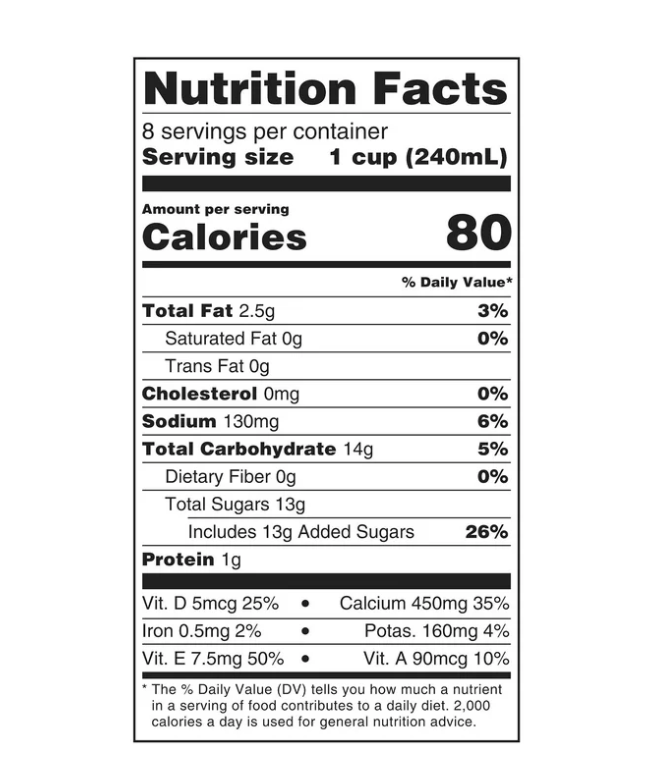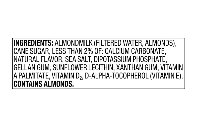 ALMONDMILK (FILTERED WATER, ALMONDS), EVAPORATED CANE JUICE SYRUP, CALCIUM CARBONATE, NATURAL VANILLA FLAVOR WITH OTHER NATURAL FLAVORS, SEA SALT, POTASSIUM CITRATE, CARRAGEENAN, SUNFLOWER LECITHIN, VITAMIN A PALMITATE, VITAMIN D2, D-ALPHA-TOCOPHEROL (NATURAL VITAMIN E).