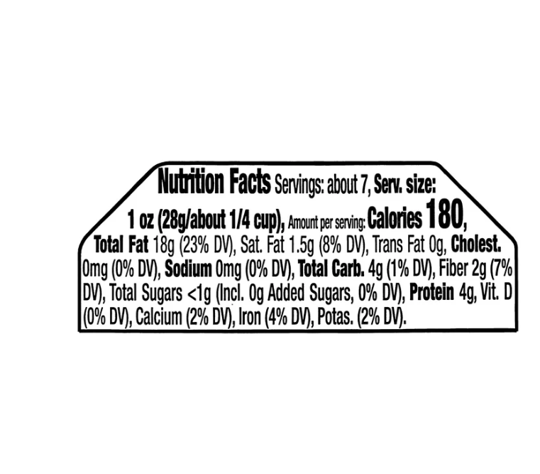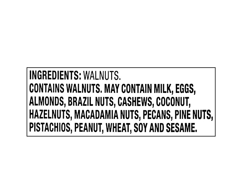 WALNUTS. CONTAINS WALNUTS. MAY CONTAIN MILK, EGGS, ALMONDS, BRAZIL NUTS, CASHEWS, COCONUT, HAZELNUTS, MACADAMIA NUTS, PECANS, PINE NUTS, PISTACHIOS, PEANUT, WHEAT, SOY AND SESAME.