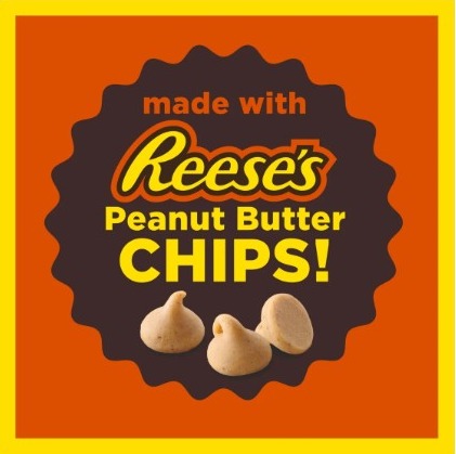 Enriched Flour Bleached (wheat flour, niacin, iron, thiamin mononitrate, riboflavin, folic acid), Sugar, Mini REESE'S Peanut Butter Chips (partially defatted peanuts, sugar, hydrogenated vegetable oil [palm kernel, soybean], corn syrup solids, dextrose, reduced protein whey, salt, palm kernel oil, artificial flavor, soy lecithin), HERSHEY'S Milk Chocolate Chips (sugar, chocolate, skim milk, cocoa butter, milk fat, soy lecithin, natural flavor), REESE'S Peanut Butter (peanuts, sugar, monoglycerides, peanut oil, salt, molasses, corn starch), Leavening (baking soda, monocalcium phosphate, sodium aluminum phosphate), Contains 2% or less of: Modified Corn Starch, Salt, Propylene Glycol Mono and Diesters, Corn Starch, Mono and Diglycerides, Color Added, Xanthan Gum, Cellulose Gum, Sodium Stearoyl Lactylate, Artificial Flavor.
