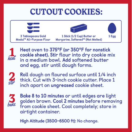 Drop Cookies:You will need:1 Stick (1/2 Cup) Butter Margarine or Spread,* Softened (Not Melted)1 Egg*Spread should have at least 65% vegetable oil.Time to bake!1. Heat oven to 375°F (or 350°F for dark or nonstick cookie sheet). Stir Cookie Mix, softened butter and egg in a medium bowl until soft dough forms.2. Drop dough by rounded teaspoonfuls 2 inches apart on ungreased cookie sheet. For 2 dozen larger cookies, drop dough by tablespoonfuls.3. Bake 7 to 9 (for larger cookies, 8 to 10 minutes) or until edges are light golden brown. Cool 1 minute before removing from cookie sheet. Cool completely; store in airtight container.High Altitude (3500-6500 ft): No change.Cutout Cookies:3 Tablespoons Gold Medal™ All-Purpose Flour1 Stick (1/2 Cup) Butter, Margarine or Spread,* Melted1 Egg1. Heat oven to 375°F (or 350°F for dark or nonstick cookie sheet). Stir flour into dry cookie mix in a medium bowl. Add melted butter and egg, stir until soft dough forms.2. Roll dough on floured surface until 1/4 inch thick. Cut with 2-inch cookie cutter. Place 1 inch apart on ungreased cookie sheet.3. Bake 5 to 7 minutes or until edges are light golden brown. Cool 2 minutes before removing from cookie sheet. Cool completely; store in airtight container.Makes: 3 dozen 2 inch cookiesHigh Altitude (3500-6500 ft): No change.