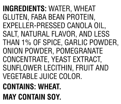 WATER, WHEAT GLUTEN, FABA BEAN PROTEIN, EXPELLER-PRESSED CANOLA OIL, SALT, NATURAL FLAVOR, AND LESS THAN 1% OF SPICE, GARLIC POWDER, ONION POWDER, POMEGRANATE CONCENTRATE, YEAST EXTRACT, SUNFLOWER LECITHIN, FRUIT AND VEGETABLE JUICE COLOR.