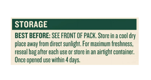 Storage: Store in a cool dry place away from direct sunlight. After opening for maximum freshness store in an airtight container and use within 4 days.