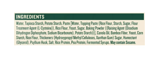 Water, Tapioca Starch, Paste [Water, Topping Paste (Rice Flour, Starch, Sugar, Flour Treatment Agent, Rice Flour, Yeast, Sugar, Baking Powder ((Raising Agent (Disodium Dihydrogen Diphosphate, Sodium Bicarbonate), Potato Starch))], Potato Starch, Canola Oil, Yeast, Bamboo Fiber, Corn Starch, Rice Flour, Thickeners (Cellulose Gum, Xanthan Gum), Sugar, Humectant (Glycerin), Psyllium Husk, Salt, Pea Protein, Rice Protein, Fermented Syrups, Vitamin Blend (Calcium Carbonate, Yeast (Yeast, Vitamin D Yeast), Riboflavin (B2), Niacin (B3), Pantothenic Acid (B5), Vitamin B6, Folic Acid (B9)).