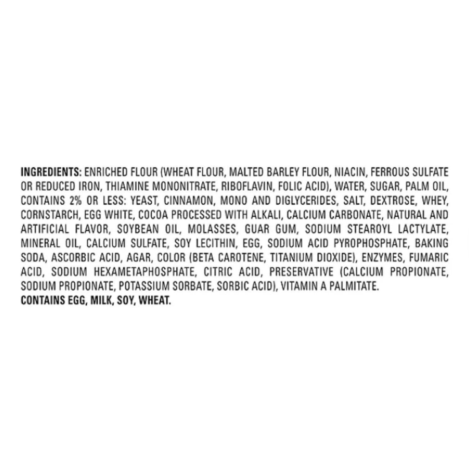 Ingredients: Enriched Flour (Wheat Flour, Malted Barley Flour, Niacin, Ferrous Sulfate Or Reduced Iron, Thiamine Mononitrate, Riboflavin, Folic Acid), Water, Sugar, Palm Oil, Contains 2% Or Less: Yeast, Cinnamon, Mono And Diglycerides, Salt, Dextrose, Whey, Cornstarch, Egg White, Cocoa Processed With Alkali, Calcium Carbonate, Natural And Artificial Flavor, Soybean Oil, Molasses, Guar Gum, Sodium Stearoyl Lactylate, Mineral Oil, Calcium Sulfate, Soy Lecithin, Egg, Sodium Acid Pyrophosphate, Baking Soda, Ascorbic Acid, Agar, Color (Beta Carotene, Titanium Dioxide), Enzymes, Fumaric Acid, Sodium Hexametaphosphate, Citric Acid, Preservative (Calcium Propionate, Sodium Propionate, Potassium Sorbate, Sorbic Acid), Vitamin A Palmitate. ContainsEgg, Milk, Soy, Wheat.