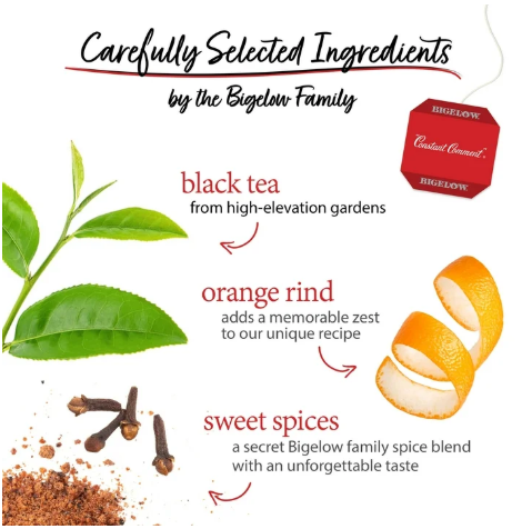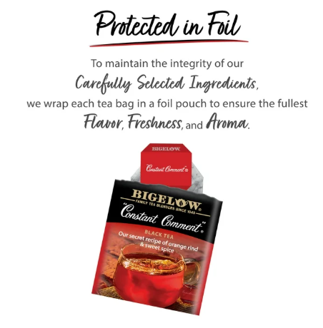 Bigelow Constant Comment, Black Tea Bags, The Bigelow original. No recipe makes us prouder. To this day members of the Bigelow family are still the only ones who blend this secret recipe of Black Tea, rind of oranges and sweet spice. One sip and you will know there is still no tea like it. Take a whiff then enjoy the one and only Constant Comment. Our ingredients are carefully selected by the Bigelow family to deliver you an uncompromised quality tea experience. Our recipe combines hand-picked tea leaves, harvested at their peak using only the top two tea leaves and the bud, blended with sweet spice and orange rind. Each box of this caffeinated black tea contains 20 tea bags. To maintain the integrity of our exceptional ingredients, we wrap each tea bag in a foil pouch to ensure the fullest flavor, freshness, and aroma. It also makes it convenient to take Bigelow Tea everywhere you go. Bigelow Tea is proud to be 100% family owned and operated since 1945. We are honored to be a Certified B Corporation. This achievement recognizes our commitment to the highest standards of social and environmental impact.