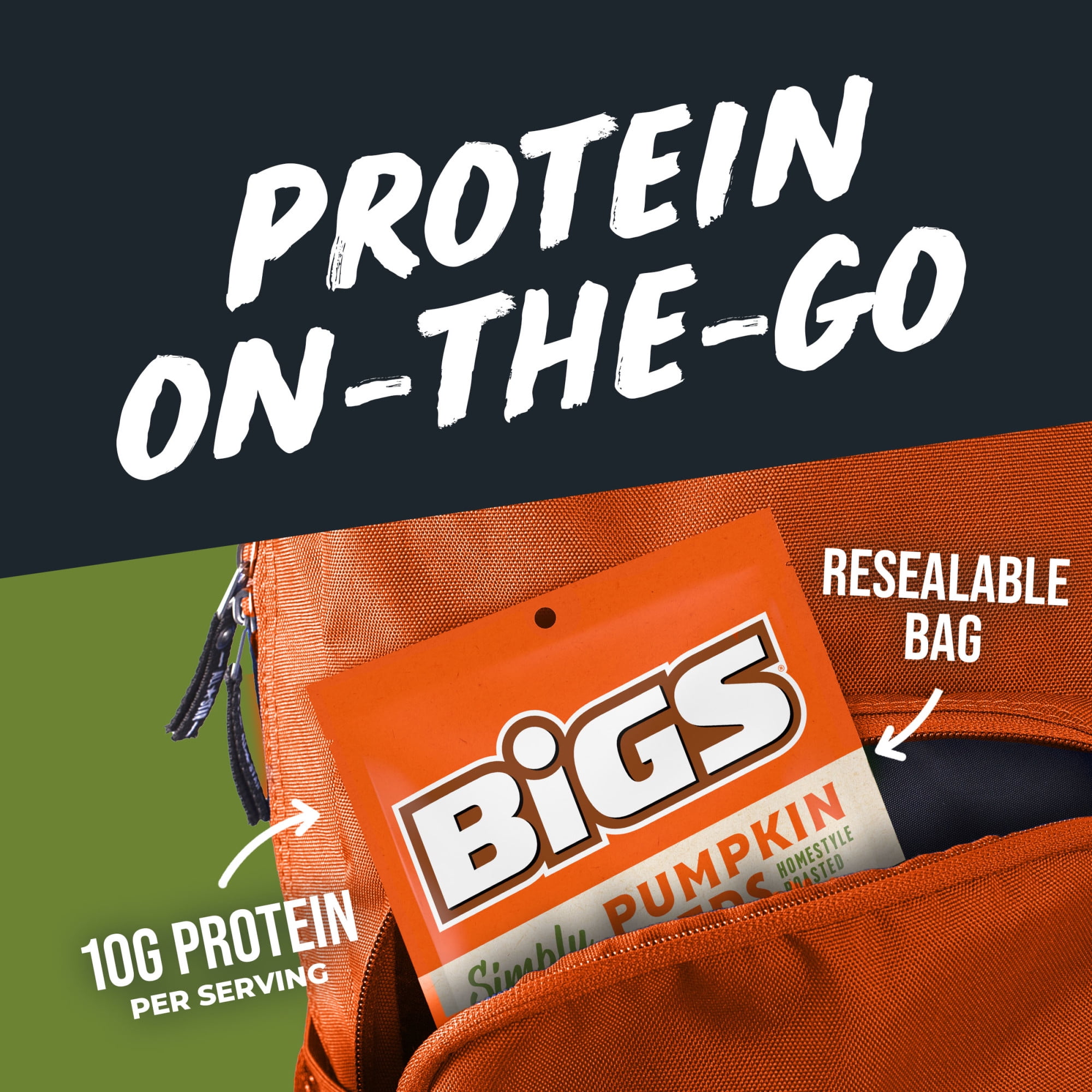 BIGS Simply Salted Homestyle Roast Pumpkin Seeds come all the way from the Willamette Valley in Oregon, and taste like they are fresh out of the oven. Simply salted with a golden crisp, our all-natural pumpkin seeds are sure to satisfy your taste buds all year round! Enjoy easy, convenient snacking any time with a 5-ounce bag. Our pumpkin seeds contain 12 g protein per serving, and have no artificial colors or preservatives. Why go small when you can go BIG?
