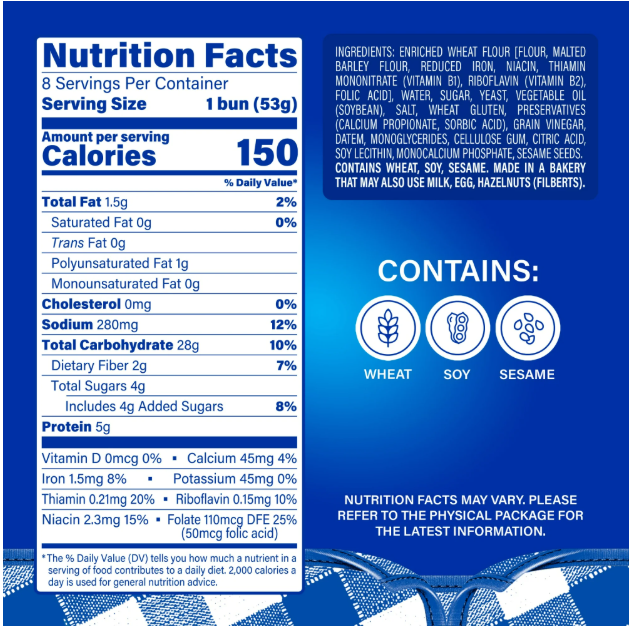 Enriched Wheat Flour [Flour, Malted Barley Flour, Reduced Iron, Niacin, Thiamin Mononitrate (Vitamin B1), Riboflavin (Vitamin B2), Folic Acid], Water, Sugar, Yeast, Vegetable Oil (Soybean), Salt, Wheat Gluten, Preservatives [Calcium Propionate, Sorbic Acid], Grain Vinegar, Datem, Monoglycerides, Cellulose Gum, Citric Acid, Soy Lecithin, Monocalcium Phosphate, Sesame Seeds.