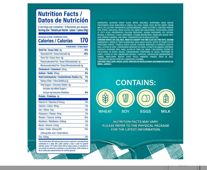 Bleached Wheat Flour, Water, Vegetable Shortening (Palm and/or Fractionated Palm, Sunflower & Canola Oil), Eggs, Sugar, Yeast, Butter (Sweet Cream (Milk), Soy Lecithin*, Preservative (Sodium Benzoate), Annatto Extract), Vegetable Protein (Pea, Potato, Fava Bean), Wheat Gluten, Salt, Mono and Diglycerides, Polyglycerol Esters of Fatty Acids, Preservatives (Calcium Propionate, Sodium Propionate), Soy Lecithin, Natural & Artificial Flavor, Enrichment (Thiamin Mononitrate, Riboflavin, Niacin, Folic Acid, Ferrous Fumarate, Zinc Oxide). *Ingredients Not in Regular Butter.