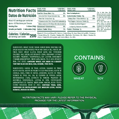 Bleached Wheat Flour, Sugar, Wheat Bran, Vegetable Oil (Palm And/Or Fractionated Palm And Canola Oil), Oat Fiber, Water, Yeast, Wheat Gluten, Wheat Germ, Salt, Datem, Vegetable Oil (Rice Bran And Canola Oil), Calcium Carbonate, Rosemary Extract, Antioxidant [Tbhq], Soy Lecithin, Enrichment [Thiamin Mononitrate, Riboflavin, Niacin, Folic Acid, Ferrous Fumarate, Zinc Oxide].