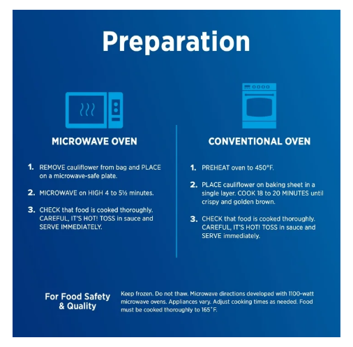 Cook thoroughly. See cooking instructions. For Food Safety & Quality: Keep frozen. Do not thaw. Microwave directions developed with 1100-watt microwave ovens. Appliances vary. Adjust cooking times as needed. Food must be cooked thoroughly to 165 degrees F. Sauce Pouch: Place sauce pouch in warm water to thaw. Conventional Oven: 1. Preheat oven to 450 degrees F. 2. place cauliflower on baking sheet in a single layer. Cook 18 to 20 minutes until crispy and golden brown. 3. check that food is cooked thoroughly. Careful, it's hot! Toss in sauce and serve immediately. Countertop Air Fryer: 1. Place cauliflower on bottom of fryer basket or rack. 2. cook at 400 degrees F for 14 to 16 minutes until crispy and golden brown. 3. Check that food is cooked thoroughly. Careful, it's hot! Toss in sauce and serve immediately. Caution! Contents are hot handle with care. Microwave oven: 1. Remove cauliflower from bag and place on a microwave-safe plate. 2. Microwave on high 4 to 5 1/2 minutes. 3. Check that food is cooked thoroughly. Careful, it's hot! Toss in sauce and serve immediately. Keep frozen - do not thaw.