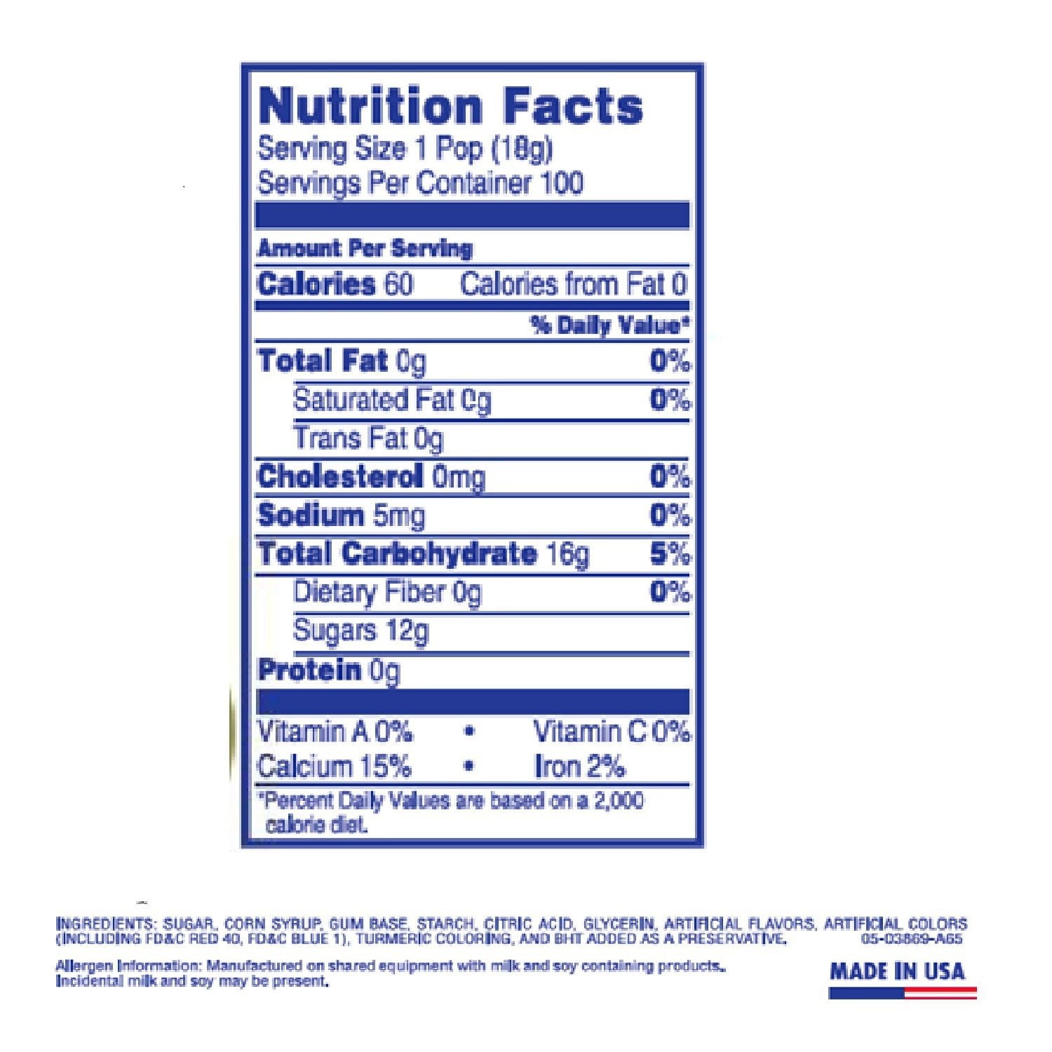 Ingredients: Sugar. Corn Syrup. Gum Base, Starch. Citric Acid, Glycerin, Artificial Flavors, Artificial Colors (Including Fo&C Red 40, Fd&C Blue 1), Turmeric Coloring, And Bht Added As A Preservative. Manufactured On Shared Equipment With Milk And Soy Containing Products. Incidental Milk And Soy May Be Present.