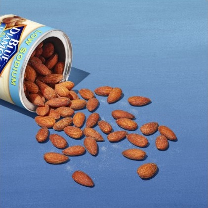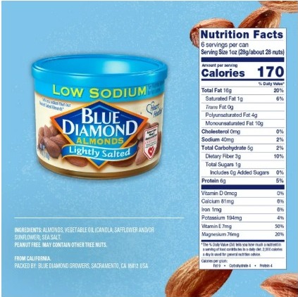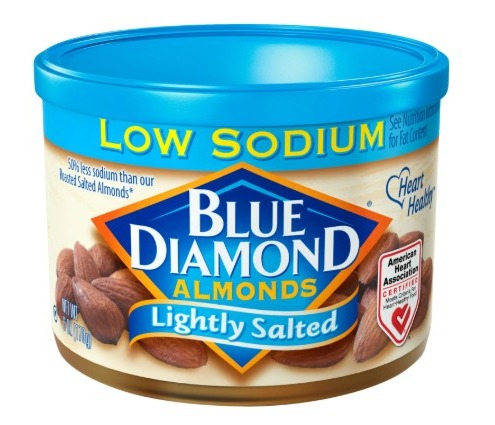 Blue Diamond Shelf Stable Almonds Lightly Salted Pieces, 6 oz Can. Being good to your body doesn't mean you have to sacrifice flavor. A healthy handful of 28 Lightly Salted premium almonds contains just 40mg of sodium the right amount to bring out the almond taste without breaking your resolve to cut down on salt. Almonds are calorie smart: No cholesterol; Good source of fiber; High source of Vitamin E.
