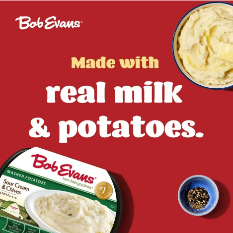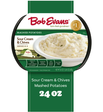 Bob Evans Mashed Potatoes are made with real sour cream, chives, milk, butter and potatoes