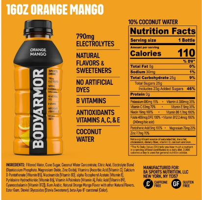 BODYARMOR Sports Drink Orange Mango isn't just any electrolyte drink; it's made with potassium-packed electrolytes and antioxidants. It's the real hydration you need to face any challenge. No artificial sweeteners, flavors or dyes, just real hydration and a burst of delicious flavor. From pre-workout on, this hydrating sports drink is designed to help you take on your day. It's not just about quenching your thirst - it's about supporting you with every gulp. BODYARMOR Sports Drinks are made with coconut water to boost flavor, making sure you stay refreshed and ready to crush your next challenge. This is the sports drink to help you achieve your goals. If you're serious about your performance and need a sports drink beverage that works as hard as you do, reach for BODYARMOR Sports Drink Orange Mango. It's the ultimate sports drink for athletes who demand the best from themselves.