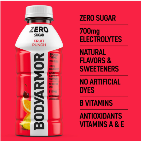 BODYARMOR Zero Sugar Sports Drink Fruit Punch. This sports drink provides real hydration with zero sugar and zero grams of carbs. Whether you're preparing for a workout, pushing through a tough training session or recovering, this sports drink provides real hydration without any compromise. Packed with electrolytes and antioxidants, BODYARMOR Zero Sugar helps you stay on top of your game while enjoying a burst of delicious fruit punch flavor. Hydration is key to performance, and BODYARMOR Zero Sugar ensures you get the real hydration you need. This functional beverage utilizes electrolytes, helping to keep you hydrated and refreshed. It's more than just a sports drink, it's a commitment to help support your hydration and lifestyle. Enjoy the benefits of BODYARMOR Zero Sugar while you stay active and hydrated with BODYARMOR Zero Sugar Fruit Punch. Perfect for your pre-workout or any time you need to hydrate, this sports drink supports your busy lifestyle. Feel the difference that real hydration can provide. Zero sugar. Zero grams of carbs. Zero to hide. BODYARMOR Zero Sugar.