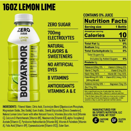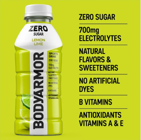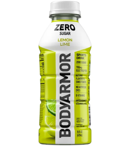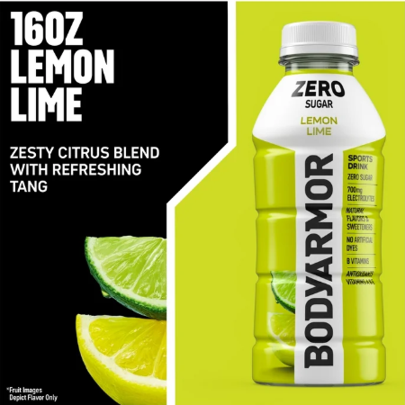 BODYARMOR Zero Sugar Sports Drink Lemon Lime. This sports drink provides real hydration with zero sugar and zero grams of carbs. Whether you're preparing for a workout, pushing through a tough training session or recovering, this sports drink provides real hydration without any compromise. Packed with electrolytes and antioxidants, BODYARMOR Zero Sugar helps you stay on top of your game while enjoying a burst of delicious lemon lime flavor. Hydration is key to performance, and BODYARMOR Zero Sugar ensures you get the real hydration you need. This functional beverage utilizes electrolytes, helping to keep you hydrated and refreshed. It's more than just a sports drink, it's a commitment to help support your hydration and lifestyle. Enjoy the benefits of BODYARMOR Zero Sugar while you stay active and hydrated with BODYARMOR Zero Sugar Lemon Lime. Perfect for your pre-workout or any time you need to hydrate, this sports drink supports your busy lifestyle. Feel the difference that real hydration can provide. Zero sugar. Zero grams of carbs. Zero to hide. BODYARMOR Zero Sugar.