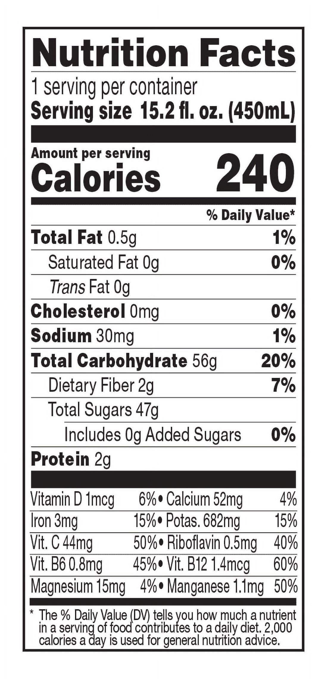 3¾ SERVINGS OF FRUIT PER BOTTLE [One serving equals 1/2 cup of juice. Daily recommendation: 4 servings of a variety of fruit, including whole fruits, for a 2,000 calorie diet (MyPlate). Not a low calorie food]