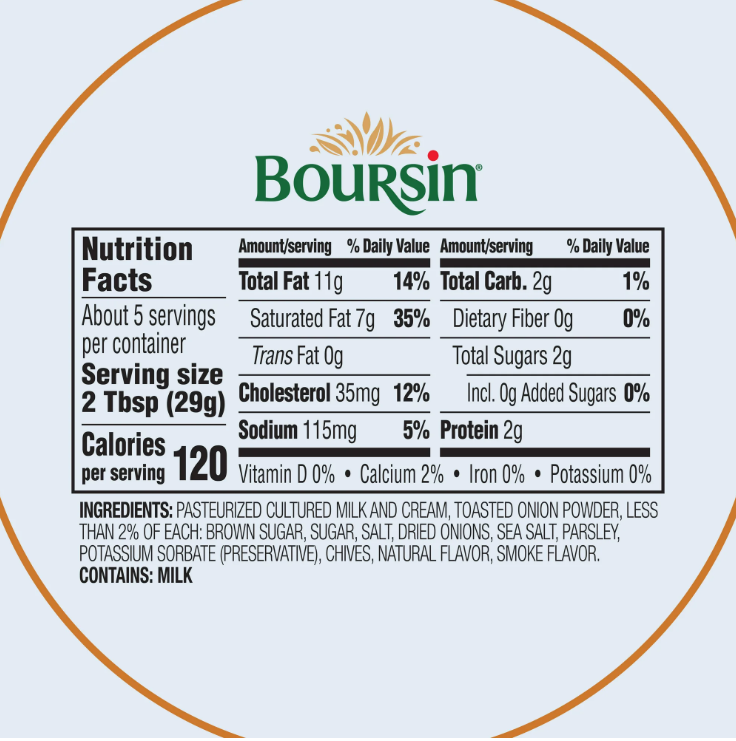 Boursin Caramelized Onion and Herbs Spreadable Cheese Puck 5.2oz. The perfect combination of sweet and savory. A perfect centerpiece for any cheese board. Spread on your favorite vegetables or crackers for a great anytime snack. Boursin is a creamy, yet crumbly blend of real refrigerated cheese, onions, and savory herbs, wrapped inside its signature foil wrapper in its own individual box for freshness.