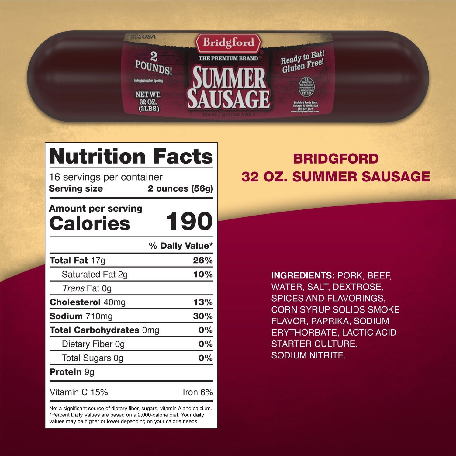 Ingredient: Pork, Beef, Water, Salt, Dextrose, Spices and Flavorings, Corn Syrup Solids Smoke Flavor, Paprika, Sodium Erythorbate, Lactic Acid Starter Culture, Sodium Nitrite.