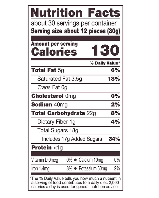 Dark Chocolate (Sugar, Chocolate*, Cocoa Butter*, Cocoa Processed With Alkali*, Milk Fat, Lecithin (Soy), Salt, Pgpr, Natural Vanilla Flavor), Sugar, Corn Syrup, Maltodextrin, Deionized Apple Juice Concentrate, Pomegranate Juice Concentrate, Apple Juice Concentrate, Cranberry Juice Concentrate, Pectin, Natural Flavor, Malic Acid, Canola Oil, Baking Soda, Sodium Citrate, Ascorbic Acid, Lemon Juice Concentrate, Citric Acid, Confectioner's Glaze. Contains Milk, Soy. Manufactured On The Same Equipment That Processes Almonds.