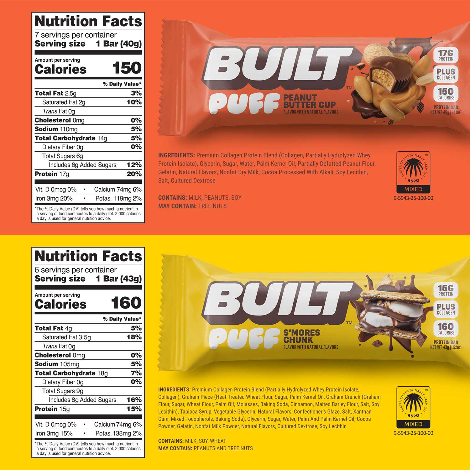 Ingredients Peanut Butter Cup: Premium Collagen Protein Blend (Collagen, Partially Hydrolyzed Whey Protein Isolate), Glycerin, Sugar, Water, Palm Kernel Oil, Partially Defatted Peanut Flour, Gelatin, Natural Flavors, Nonfat Dry Milk, Cocoa Processed With Alkali, Soy Lecithin, Salt, Cultured Dextrose. Contains milk, peanuts, soy. May contain tree nuts.