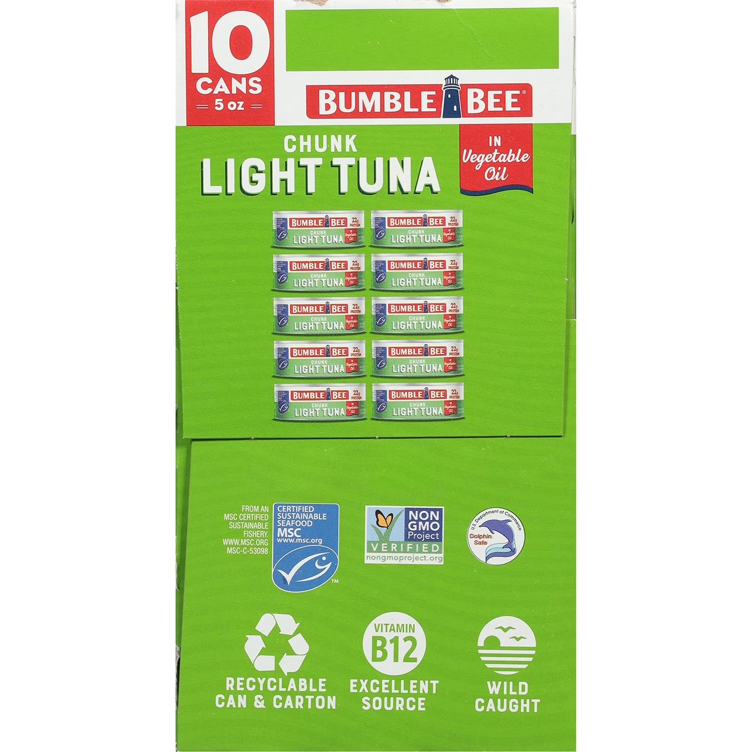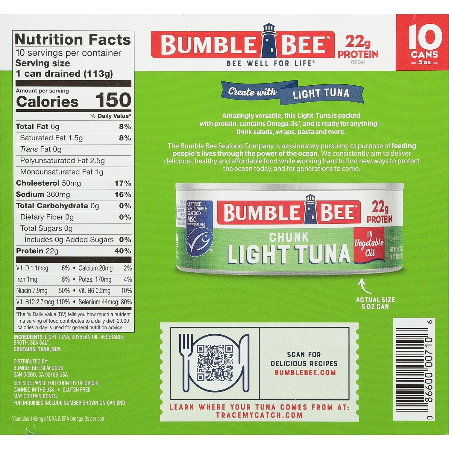 BUMBLE BEE Chunk Light Tuna in Oil is excellent for salads, lettuce wraps, sandwiches, and many hot dishes too. This convenient 10 count package of 5oz. cans allows you to keep your pantry well stocked.