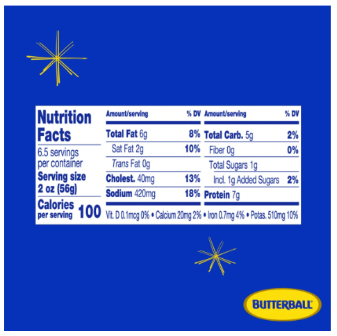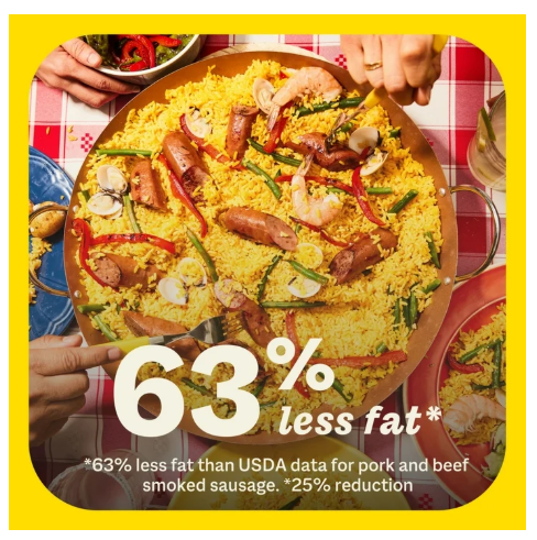 - Butterball fully cooked turkey sausage contains 63% less fat than USDA data for cooked pork sausage