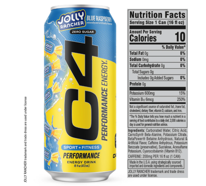 C4 Performance Energy Drink, Jolly Rancher Blue Raspberry, 16oz, Single Can