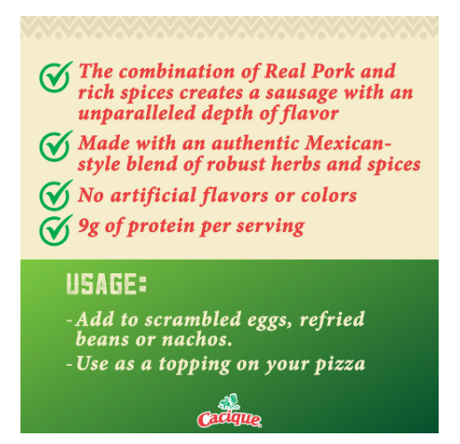 Cacique Pork Chorizo, 9 oz is a Refrigerated/ Chilled product, that is sold in Plastic packaging.