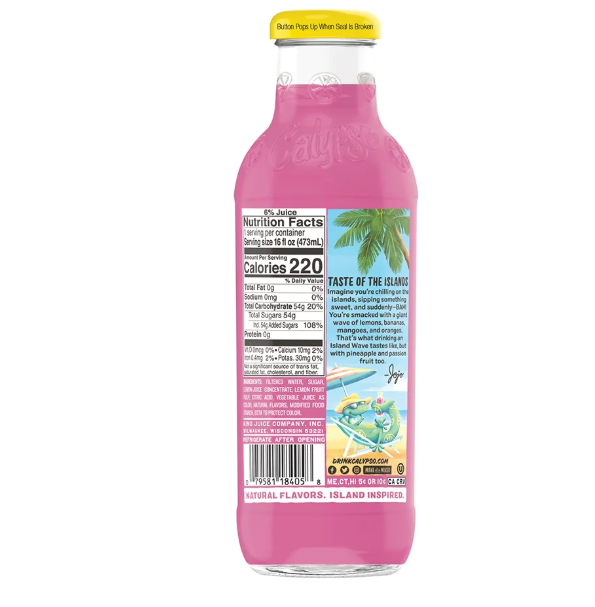 Taste of the islands. Real lemon bits. On island time. Taste of the Islands: Imagine you're chilling on the islands, sipping something sweet, and suddenly - bam! You're smacked with a giant wave of lemons, bananas, mangoes, and oranges. That's what drinking an Island Wave tastes like, but with pineapple and passion fruit too. - Jojo. Make it a mixer. Natural flavors. Island-inspired. drinkcalypso.com. Facebook. Twitter. Instagram.