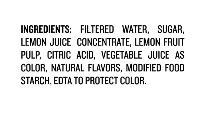 Filtered Water, Sugar, Lemon Juice Concentrate, Lemon Fruit Pulp, Citric Acid, Vegetable Juice as Color, Natural Flavors, Modified Food Starch, EDTA to Protect Color.