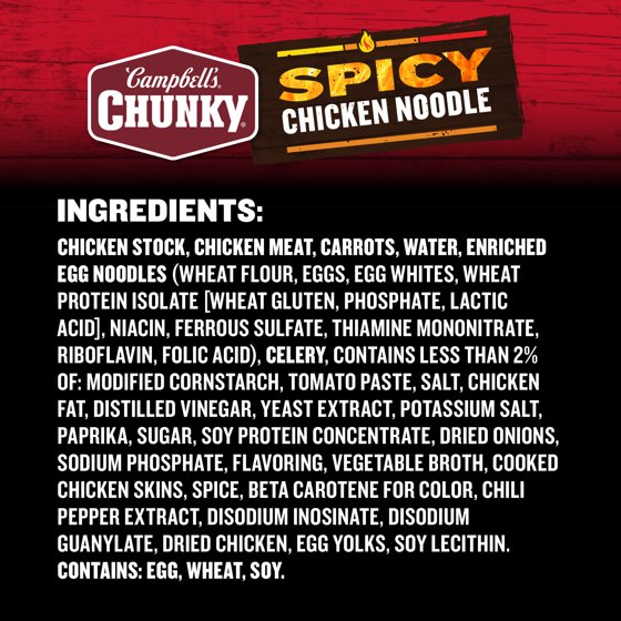 Ingredients: Chicken Stock, Chicken Meat, Carrots, Water, Enriched Egg Noodles (Wheat Flour, Eggs, Egg Whites, Wheat Protein Isolate [Wheat Gluten, Phosphate, Lactic Acid], Niacin, Ferrous Sulfate, Thiamine Mononitrate, Riboflavin, Folic Acid), Celery, Contains Less Than 2% Of: Modified Cornstarch, Tomato Paste, Salt, Chicken Fat, Distilled Vinegar, Yeast Extract, Potassium Salt, Paprika, Sugar, Soy Protein Concentrate, Dried Onions, Sodium Phosphate, Flavoring, Vegetable Broth, Cooked Chicken Skins, Spice, Beta Carotene For Color, Chili Pepper Extract, Disodium Inosinate, Disodium Guanylate, Dried Chicken, Egg Yolks, Soy Lecithin. Contains: Egg, Wheat, Soy.