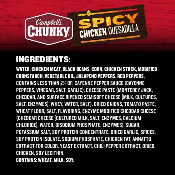 Ingredients: Water, Chicken Meat, Black Beans, Corn, Chicken Stock, Modified Cornstarch, Vegetable Oil, Jalapeno Peppers, Red Peppers, Contains Less Than 2% Of: Cayenne Pepper Sauce (Cayenne Peppers, Vinegar, Salt, Garlic), Cheese Paste (Monterey Jack, Cheddar, And Surface Ripened Semisoft Cheese [Milk, Cultures, Salt, Enzymes], Whey, Water, Salt), Dried Onions, Tomato Paste, Wheat Flour, Salt, Flavoring, Enzyme Modified Cheddar Cheese (Cheddar Cheese [Cultured Milk, Salt, Enzymes, Calcium Chloride], Water, Disodium Phosphate, Enzymes), Sugar, Potassium Salt, Soy Protein Concentrate, Dried Garlic, Spices, Soy Protein Isolate, Sodium Phosphate, Chicken Fat, Annatto Extract For Color, Yeast Extract, Chili Pepper Extract, Dried Chicken, Soy Lecithin. Contains: Wheat, Milk, Soy.