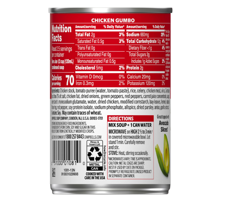 Cozy up with a steamy bowl of Campbell's Condensed Chicken Gumbo Soup. A family favorite for generations, this chicken soup is crafted with rice, chicken meat with no antibiotics, and farm-grown veggies like celery, okra and peppers in a savory, spice-laden broth. The result is a satisfying chicken gumbo soup that brings a smile with every spoonful. Top it with avocado slices, season it with fresh herbs, or pair it with a sandwich or salad for something quick and easy. This convenient canned soup is a year-round pantry staple and the perfect comfort food on a chilly day or when you’re feeling under the weather. Simply mix the condensed soup with 1 can of water and microwave on high for 2.5 to 3 minutes in a covered microwave-safe bowl, or heat in a pot on the stove, stirring occasionally. Each 10.5 oz recyclable can contains about 2.5 servings of microwave soup and features a non-BPA lining. From Chicken Gumbo to Cream of Mushroom and everything in between, Campbell’s makes delicious soups in flavors your family knows and loves, with quality, farm-grown ingredients in every can. M’m! M’m! Good! This product is packaged in a metal can, and is shelf-stable.
