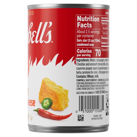 Ingredients: Water, Red Peppers, Modified Cornstarch, Tomato Puree (Water, Tomato Paste), Wheat Flour, Cheddar And Semisoft Cheese (Milk, Cultures, Salt, Enzymes), Jalapeno Peppers, Contains Less Than 2% Of: Cayenne Pepper Sauce (Cayenne Peppers, Vinegar, Salt, Garlic), Salt, Whey, Sugar, Sour Cream, Milk, Milkfat, Beta Carotene For Color, Chili Pepper Extract, Lactic Acid, Vinegar. Contains: Wheat, Milk.