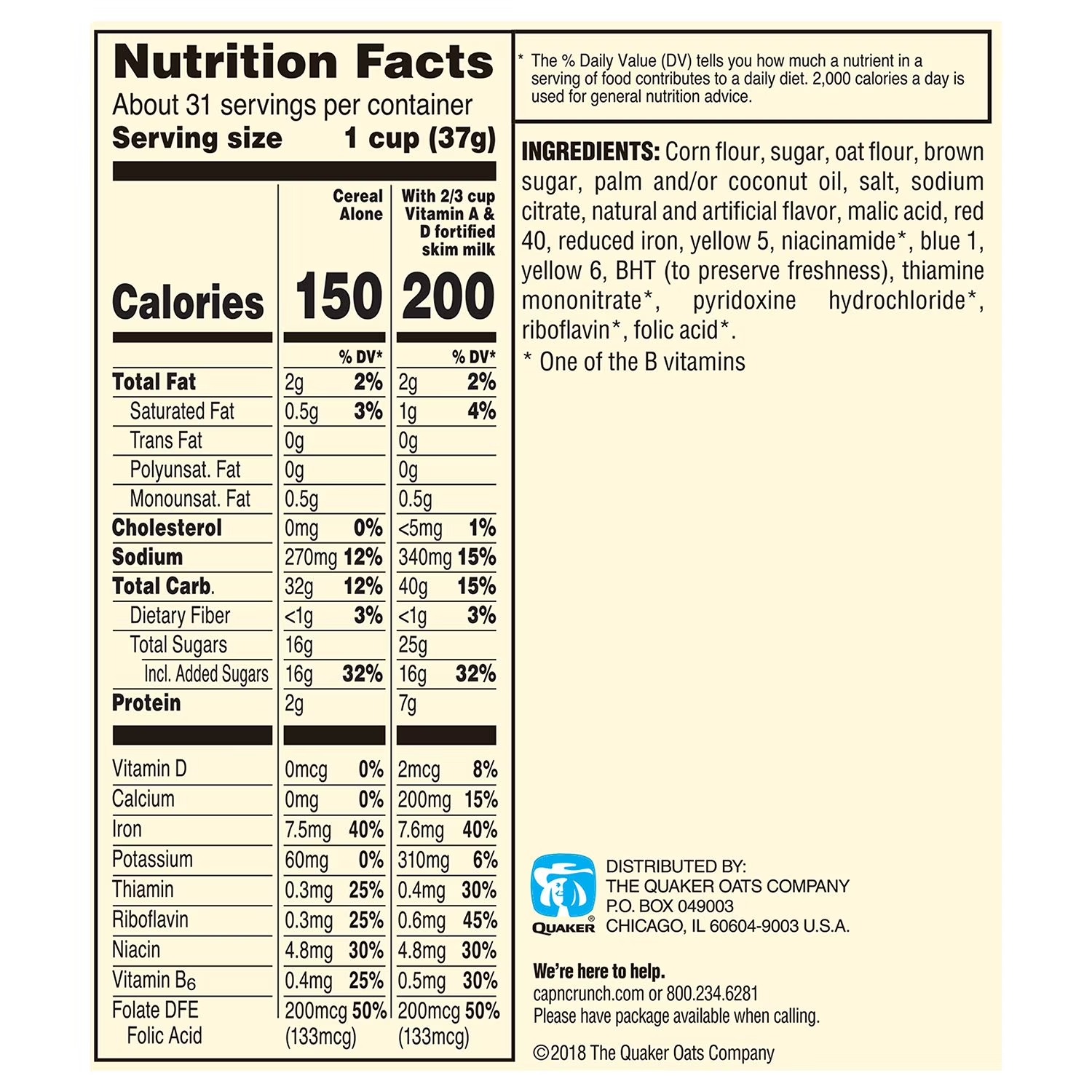 Wake up to the sweet and crunchy delight of Cap'n Crunch Cereal. This breakfast classic combines a hearty blend of corn and oats with a sweet, sugary taste that has been a morning staple for generations. Formulated with seven essential vitamins and minerals, and containing 0 grams of trans fats, it's a tasty way to kickstart your day. Enjoy it with your favorite dairy or non-dairy milk, pair it with fresh fruit or yogurt, or simply savor it straight from the box as the perfect anytime snack.