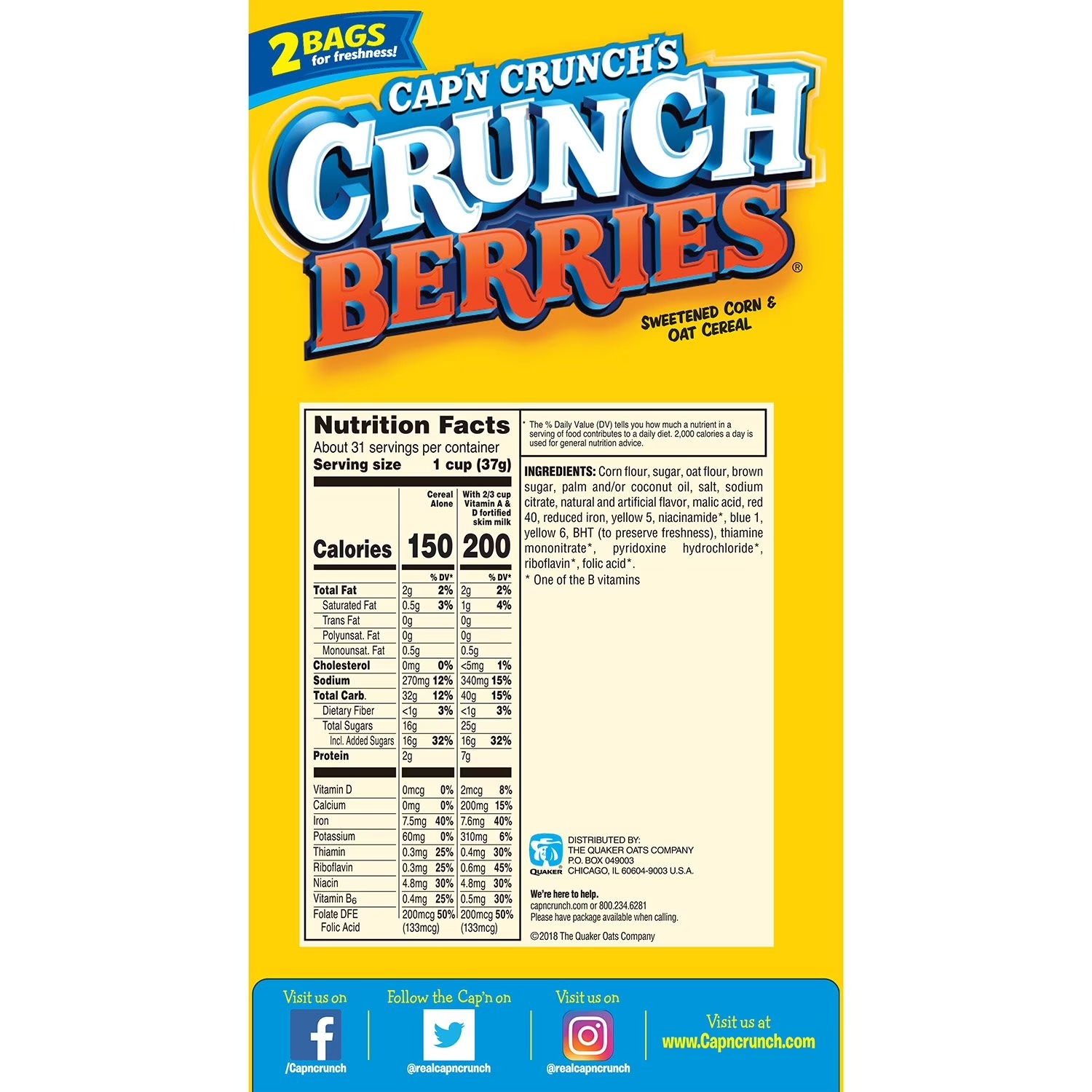 This pack includes 2 large bags of Cap’n Crunch’s Crunch Berries cereal to ensure optimal freshness. Experience a berry crunchy twist on the original crunch you love. With bursts of colorful berry flavor in red, blue, green, and purple pieces, snacking has never been more delightful. Grab a box and let your taste buds rock in a berry crunchy way - your mouth will thank you for it.